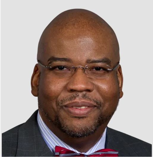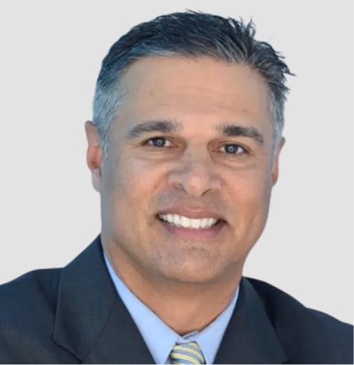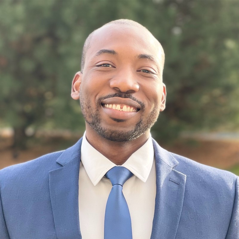 A man wearing a blue suit, white shirt, and blue tie smiles at the camera outdoors with trees blurred in the background.