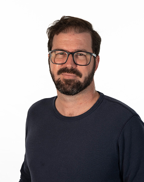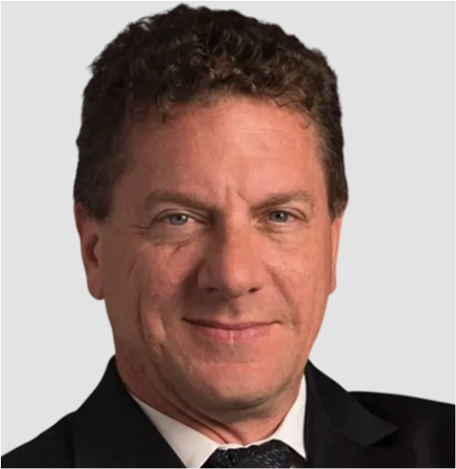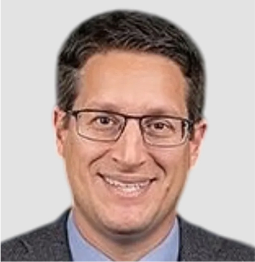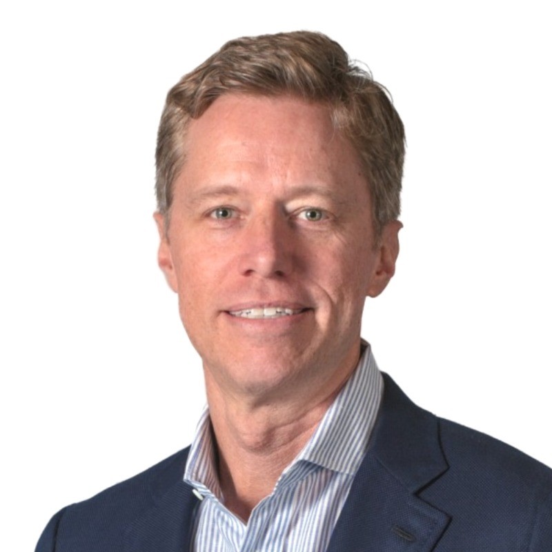 Portrait of a middle-aged man with light brown hair, wearing a navy blue blazer and a light blue striped shirt, smiling at the camera against a plain white background.