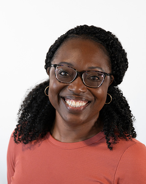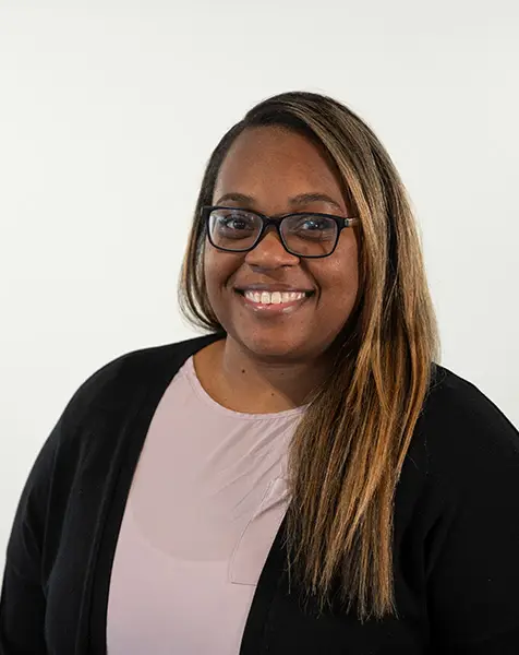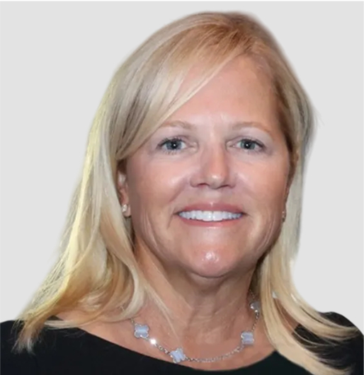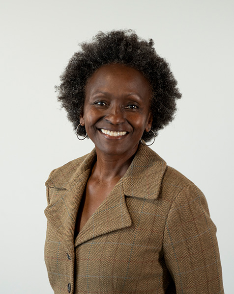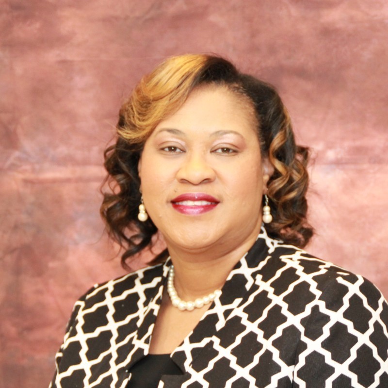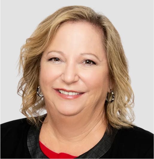 A woman with curled hair wearing a black and white patterned jacket, pearl necklace, and earrings poses in front of a brownish-pink backdrop, softly smiling—proudly supporting Feeding Northeast Florida’s mission.