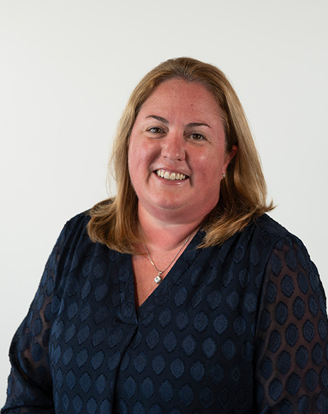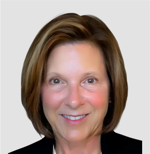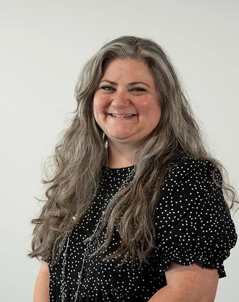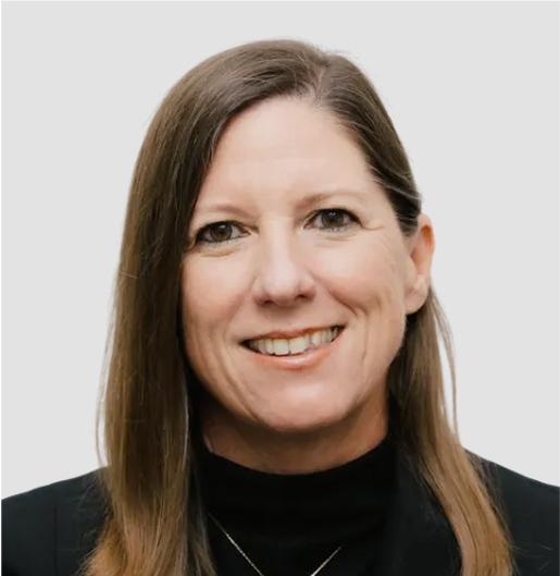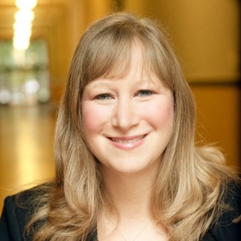 A woman with long, light brown hair and bangs smiles at the camera. She is wearing a dark blazer and is in a warmly lit hallway with blurred lights in the background.